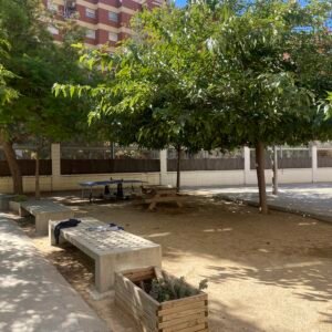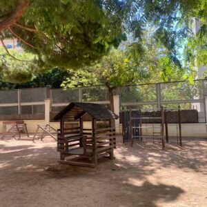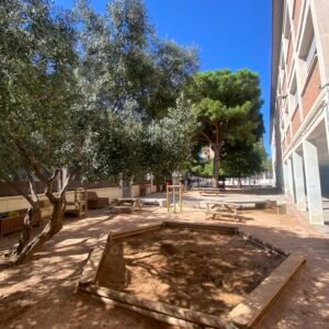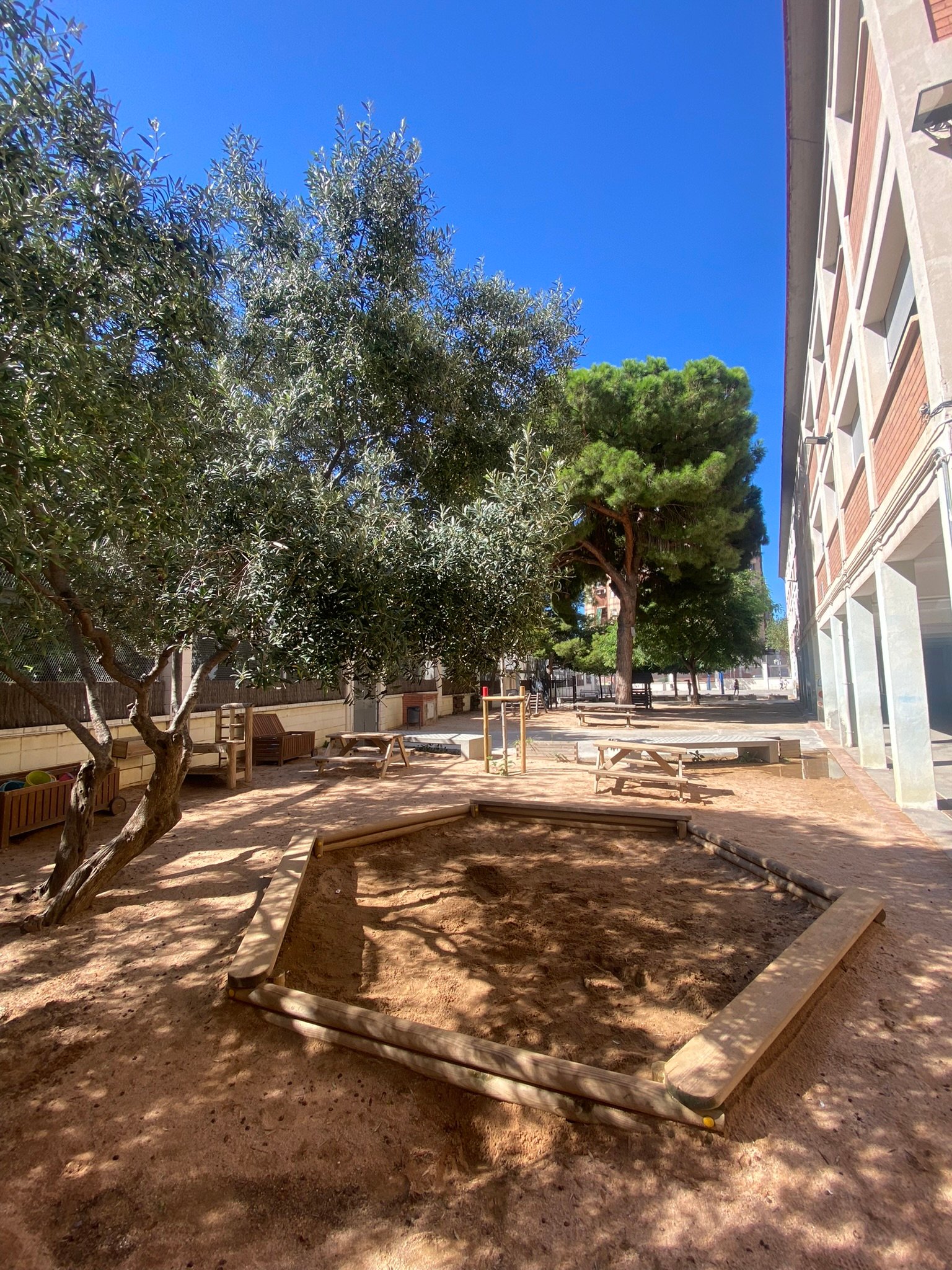 Un pati ple d’arbres, estructures de joc, espai de sorral i jardineres que gaudeix l’alumnat del centre i els infants del barri.