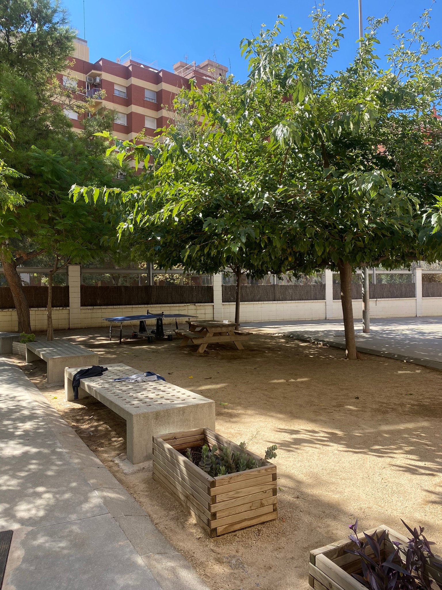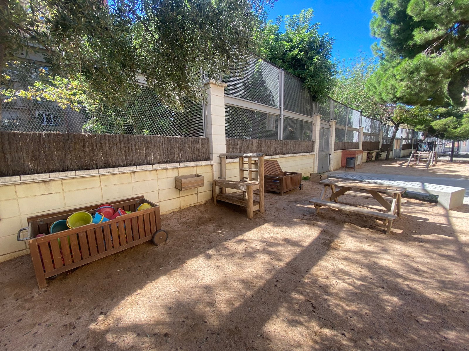 Un pati ple d’arbres, estructures de joc, espai de sorral i jardineres que gaudeix l’alumnat del centre i els infants del barri.