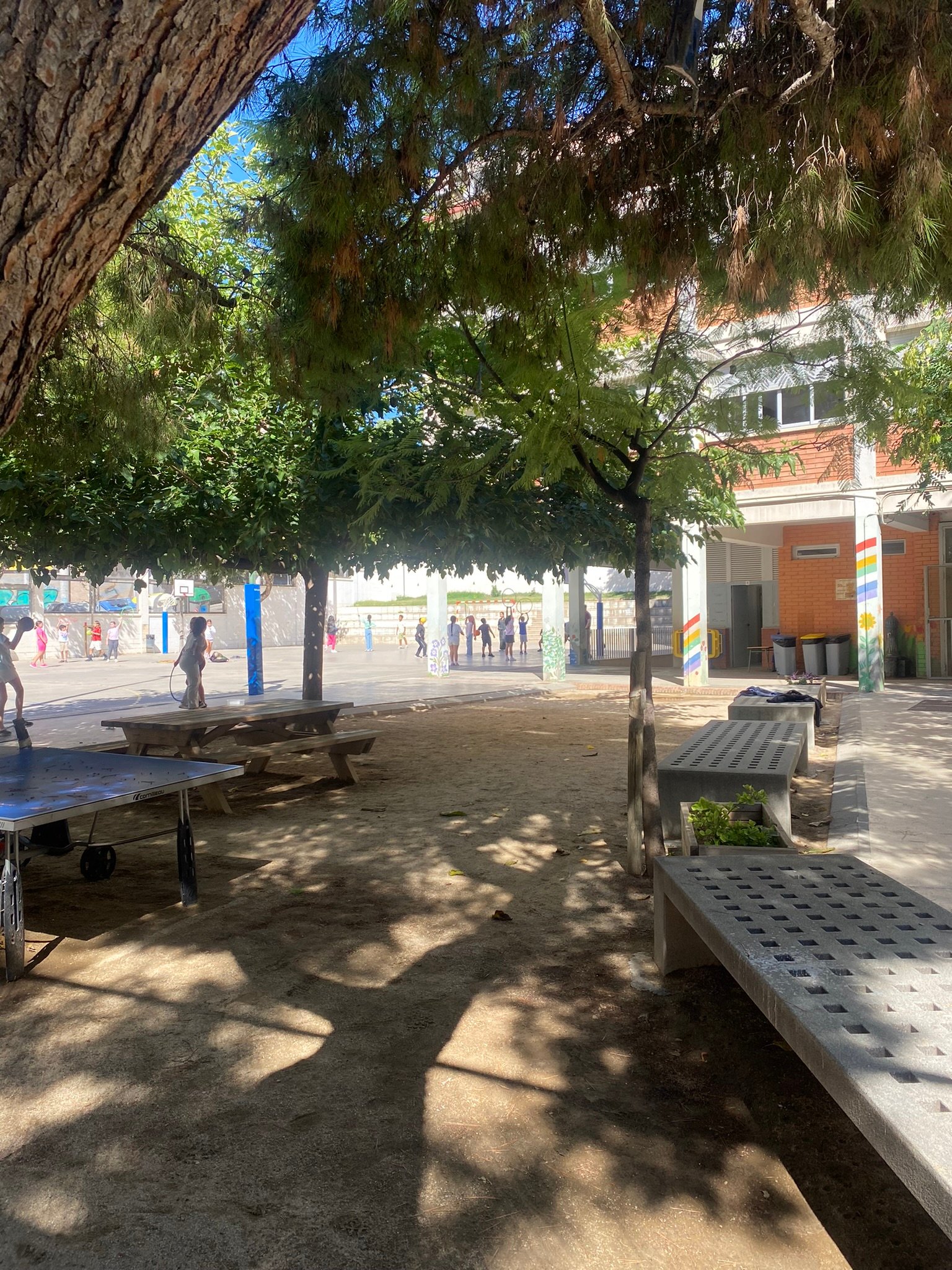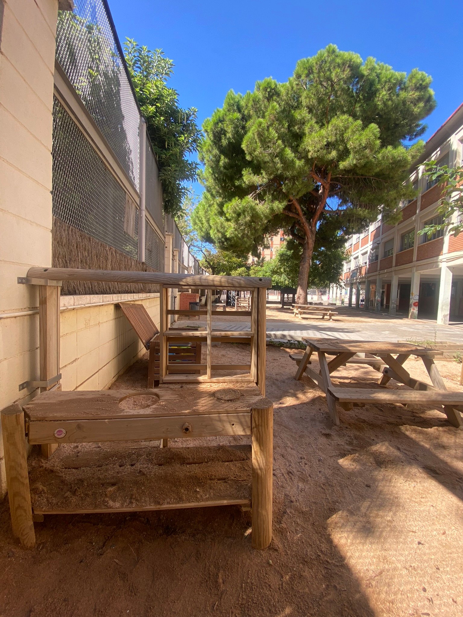 El pati que hi ha avui dia és gràcies a l’equip de mestres que des de fa més de 10 anys manté un pati ple d’arbres i vegetació i a les famílies de l’escola que van fer possible les noves estructures de joc i el sorral.