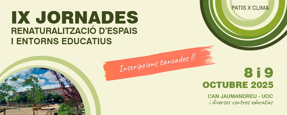 Els dies 8 i 9 d’octubre de 2025 tornen les Jornades de Renaturalització d’Espais i Entorns Educatius, que enguany celebren la seva novena edició, consolidant-se com una cita de referència per a totes aquelles persones i professionals que treballen per transformar l’escola i la ciutat davant dels reptes ambientals i socials del present.